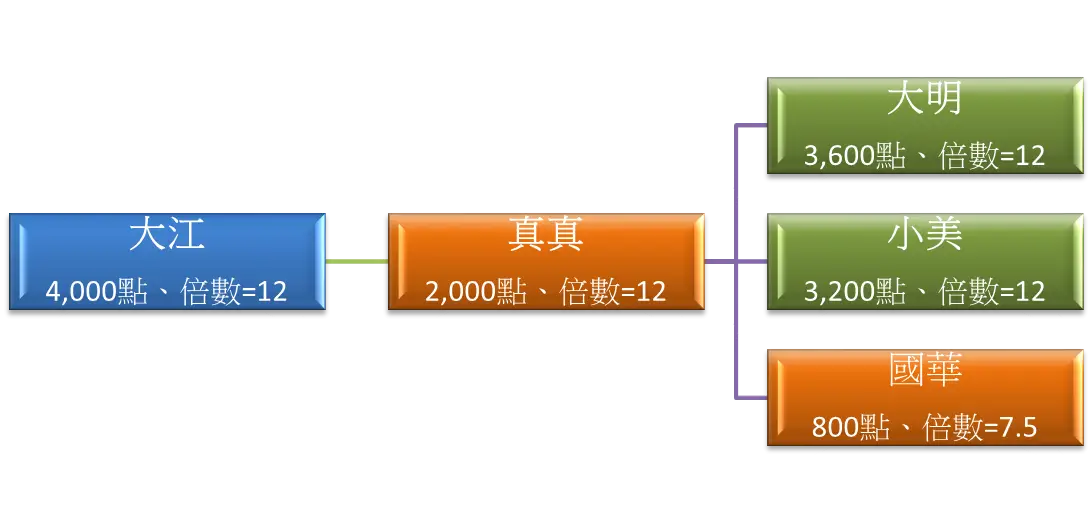真真E事業網路內有大明及小美2個事業體,但自己組織業績(含國華)僅有2,800點未登頂;此時,真真雖可獲取來自大明及小美組織的領導成就獎金,但對上層領導人(大江)而言,卻因自己組織業績未登頂,僅能獲得8,960(=2,800*3.2)元之領導成就獎金。
