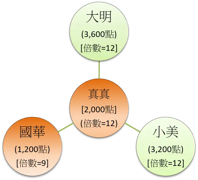 組織績效獎金 = Σ(組織內下層經理人組織業績總點數 * 倍數差距)。