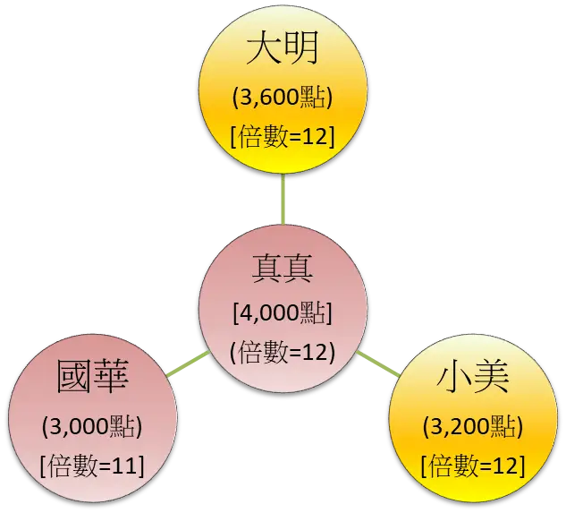真真E事業網路內有2位頂級經理人大明及小美(≧3,200點)的事業體,而真真自己的組織業績(含國華)3,200(=2,000+1,200)點亦登頂,此時雖然與大明及小美之間所得佣金倍數已無差距,亦無績效獎金,但可獲得更高的領導成就的獎勵。