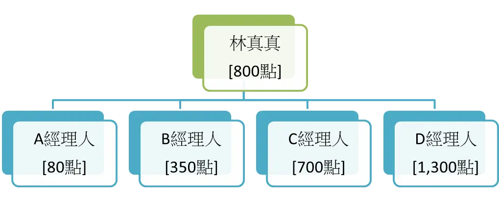 假設本月林真真個人業績點數達成800點,並且A經理人組織業績80點、B經理人組織達成350點、C經理人達成700點、D經理人達到1,300點,則